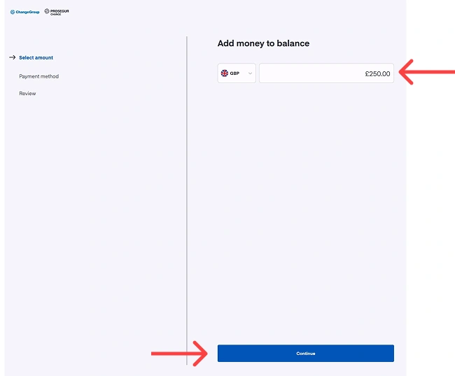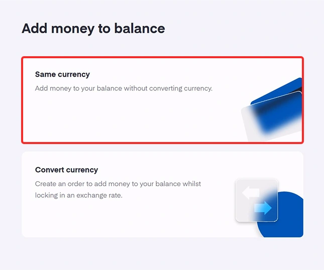 - Haz clic en «Misma divisa» para añadir dinero a tu saldo sin conversión de divisa.
